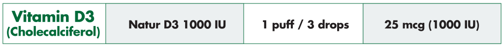 NaturD3 400 IU: 1 puff / 5 drops per day NaturD3 1000 IU: 1 puff / 3 drops per day