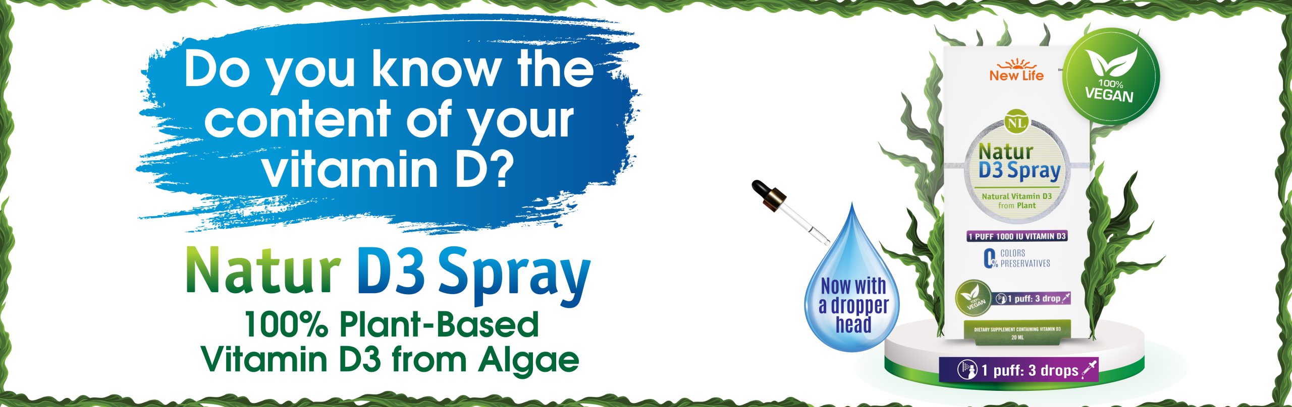NaturD3 400 IU and 1000 IU is offered both with a spray head and a dropper head. It is a vegan vitamin D3 that does not contain any preservative additives and is 100% plant-based. It does not contain any sweeteners or BHA.