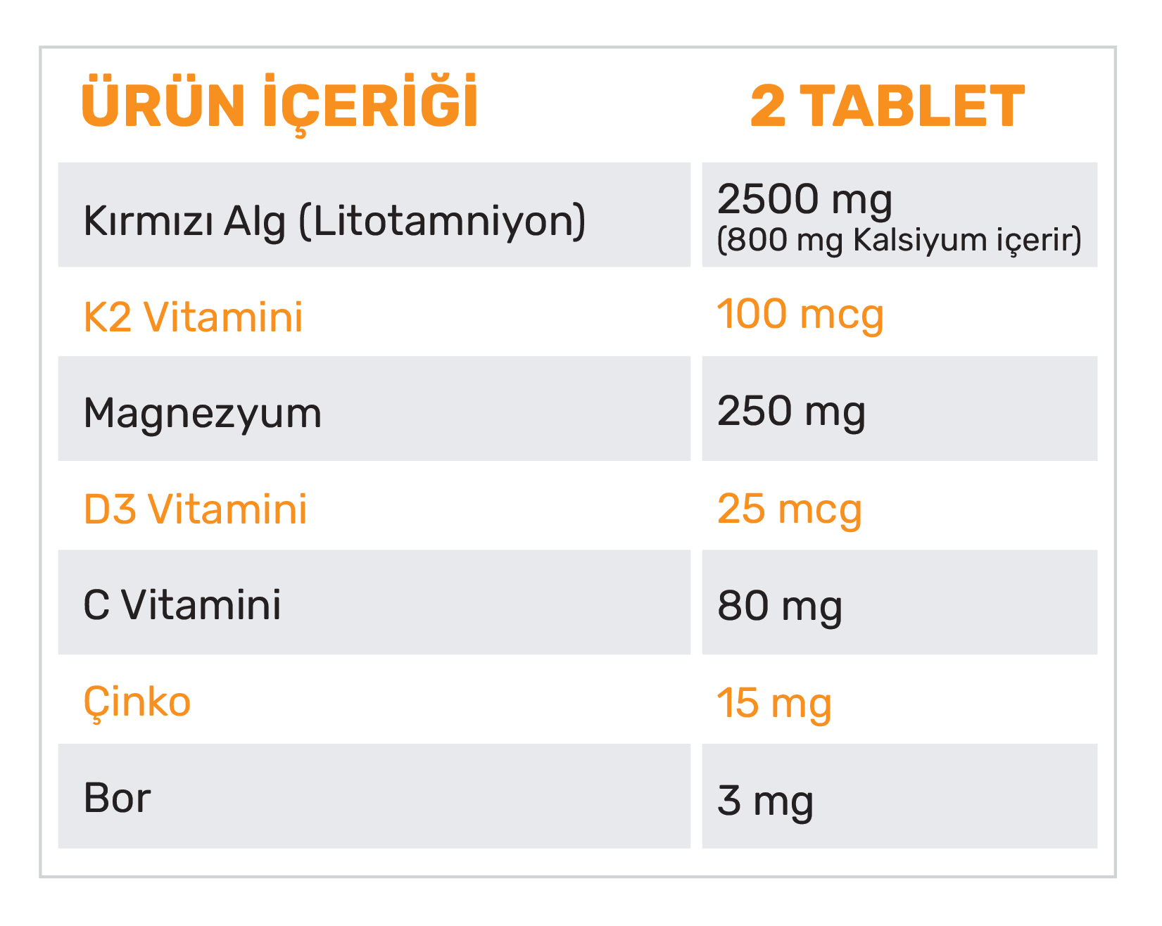 Algoste K2’ de Kemik sağlığı için önemli olan alglerden elde edilen Kalsiyum ve K2 vitamini kombinasyonunun yanında Mg, D & C vitamini, Çinko ve Bor içeren bir kemik sağlığı multivitamin & mineral ürünüdür.
