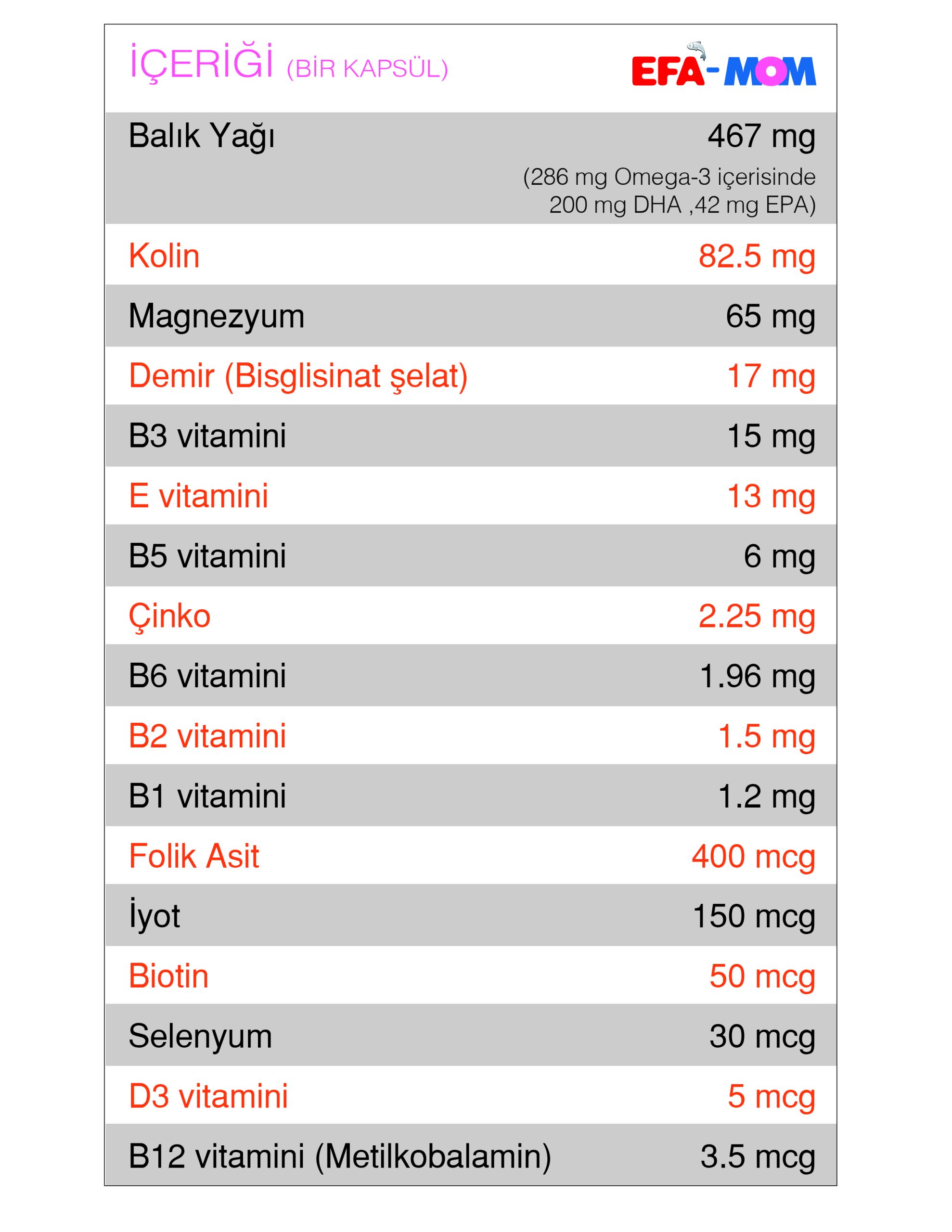 Tüm kadınların farklı ihtiyaçlarını karşılamaya yönelik, aktif folik asit, şelatlı demir, kolin, DHA, iyot ve diğer vitamin & mineraller EFA Mom’ da tek kapsülde.