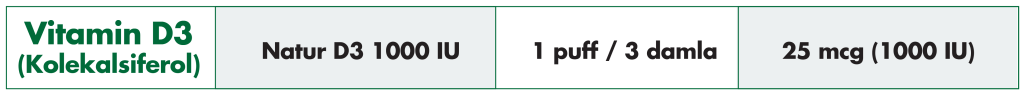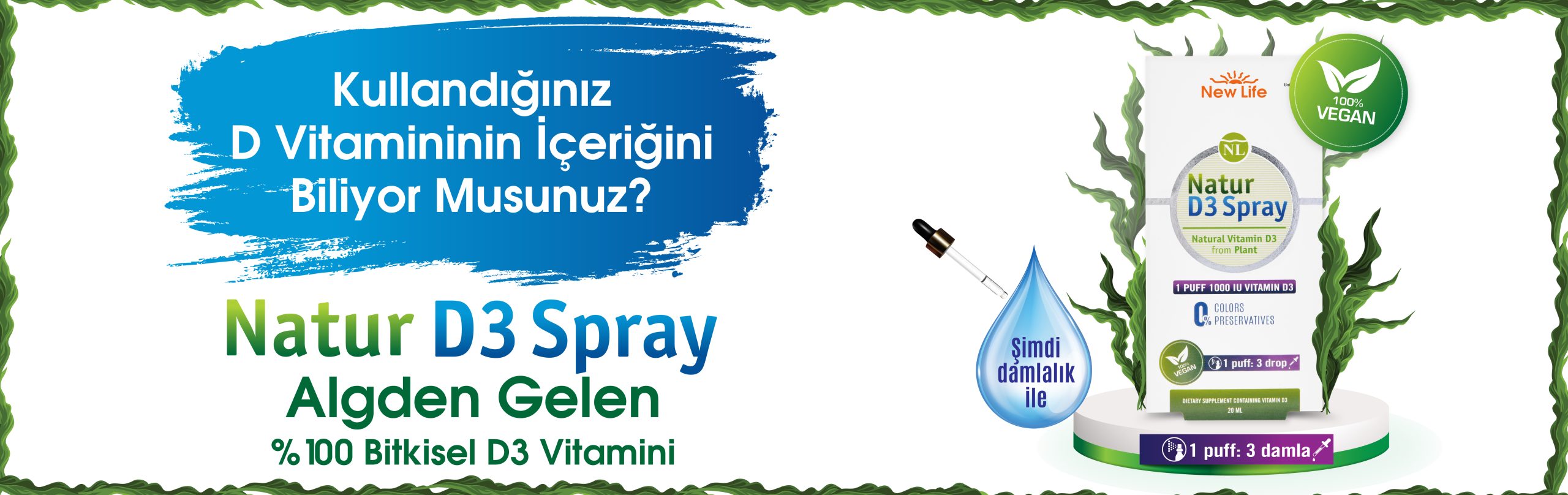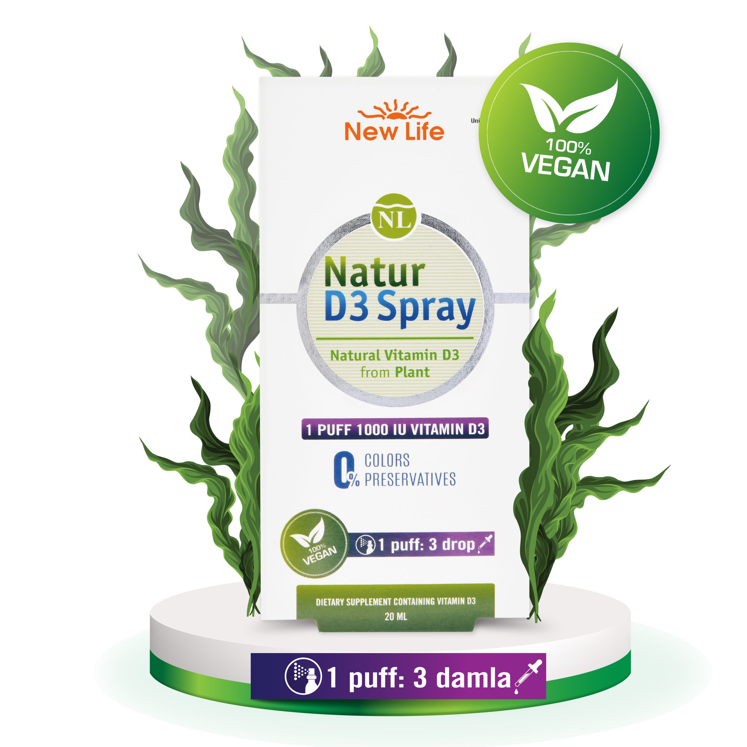 NaturD3 1000 IU, hem sprey hem damlalık başlığa sahiptir. Hiçbir koruyucu katkı maddesi içermeyen %100 bitkisel kaynaklı vegan D3 vitaminidir. Tatlandırıcı ve BHA içermez.
